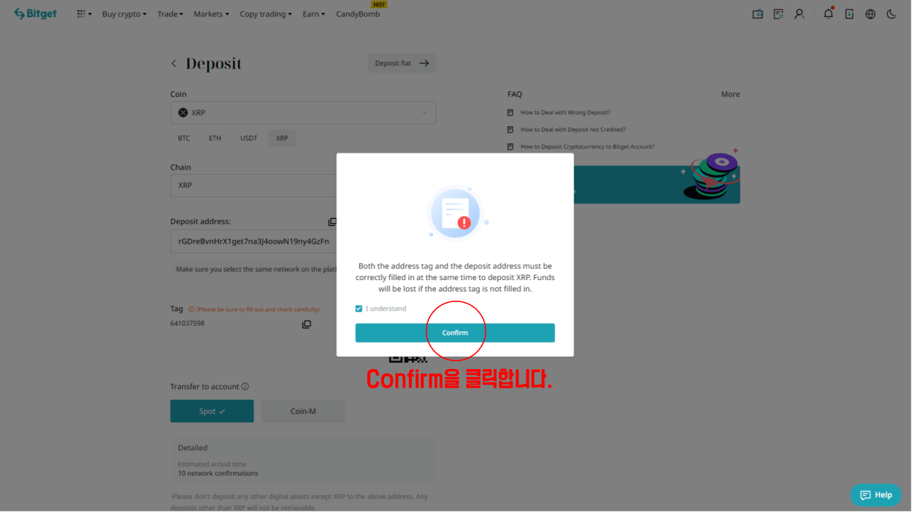 그러면 리플의 입금주소와 Tag를 확인할 수 있으며