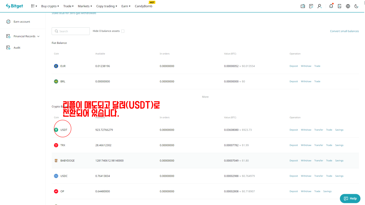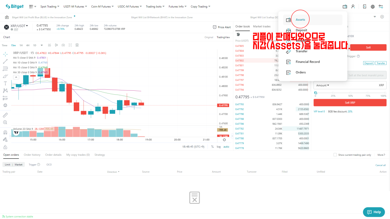 리플이 매도되어 달러로 전환된 것을 확인할 수 있습니다.