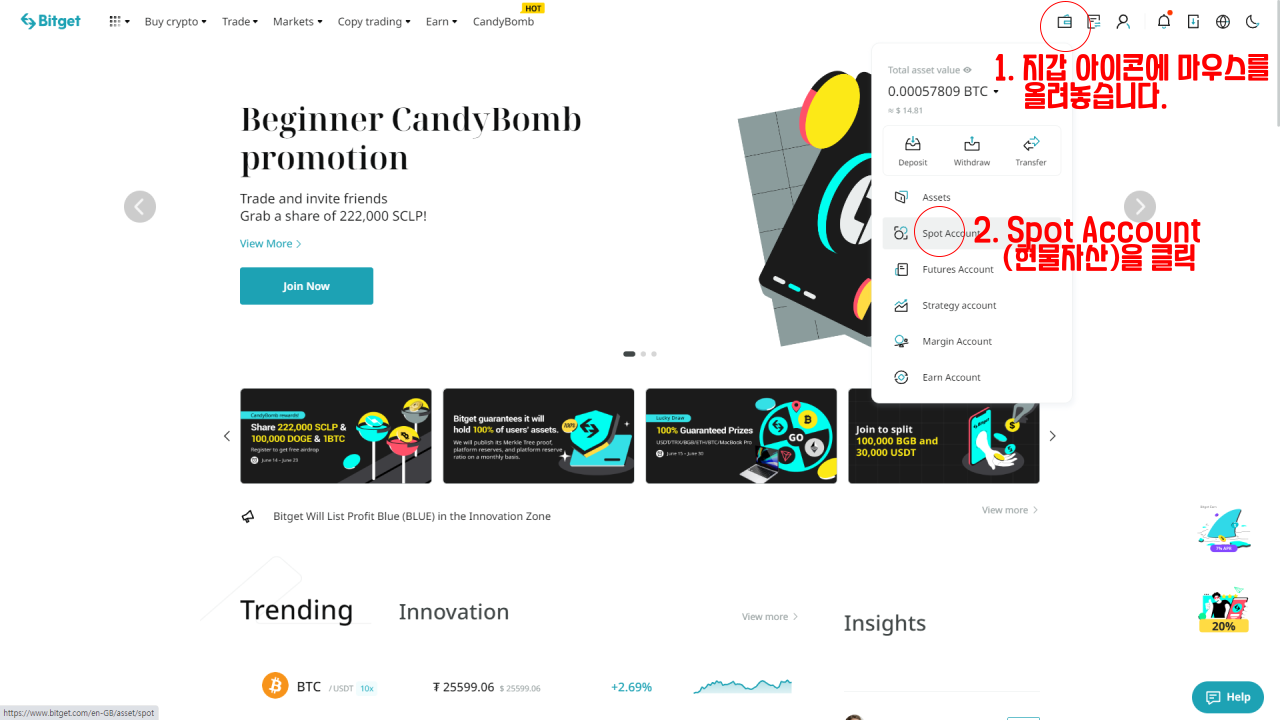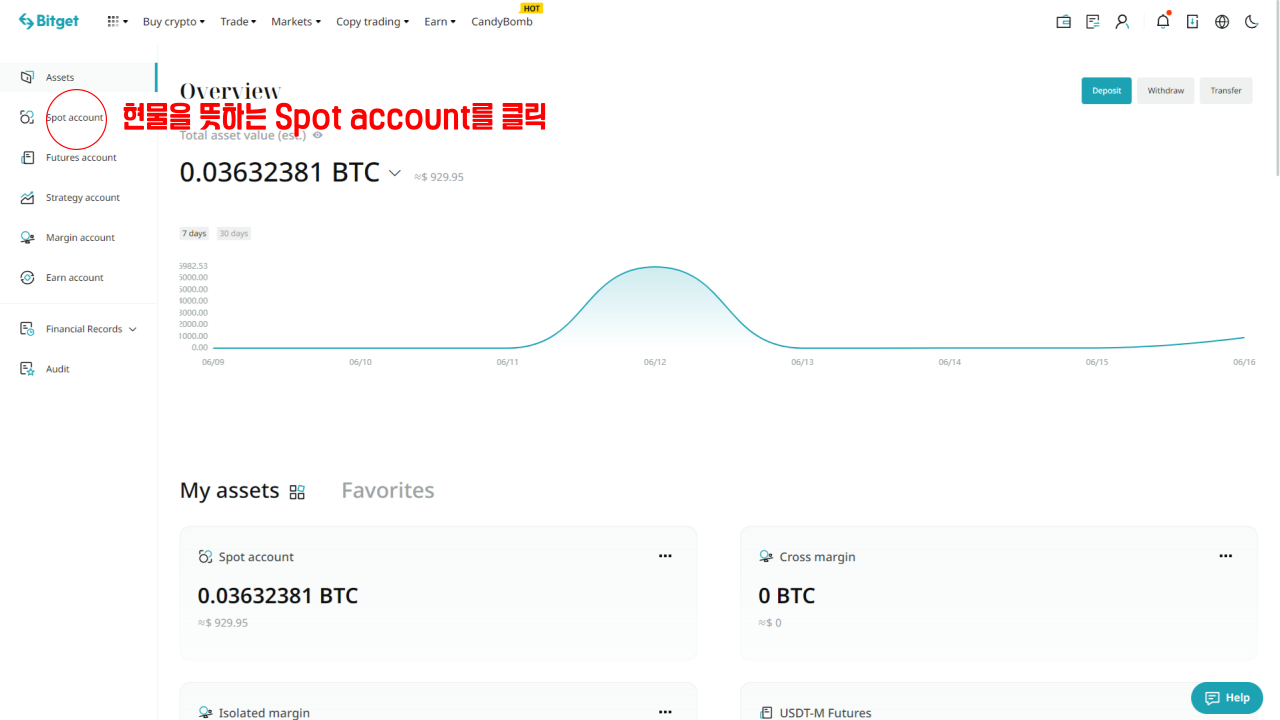 여기서 현물 자산을 뜻하는 Spot Account를 클릭합니다.